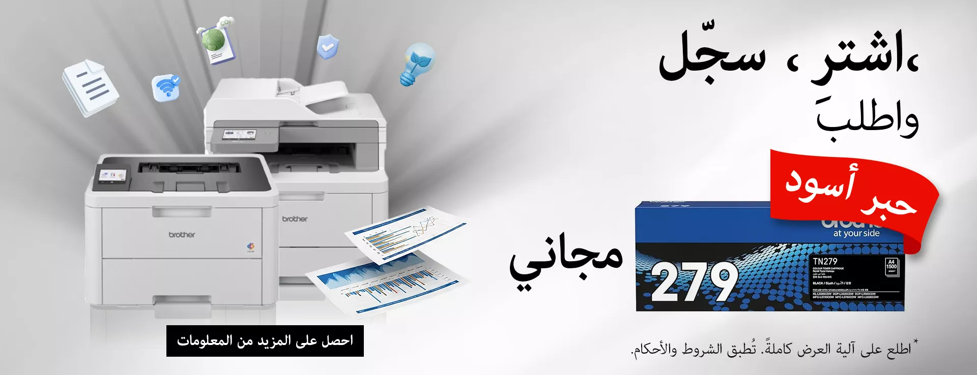- يسري العرض عند شراء أي من طابعات الليزر الملونة المشاركة [MFC-L8390CDW ، MFC-L3760CDW ، MFC-L3720CDW ، DCP-L3520CDW ، DCP-L3560CDW ، HL-L3280CDW و HL-L3220CW] خلال فترة العرض.