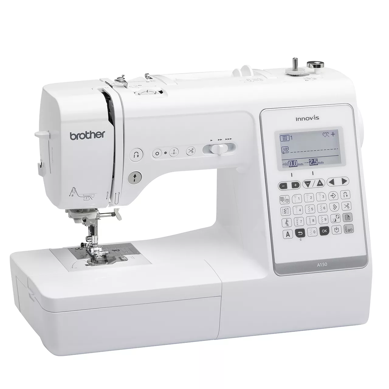 Innov-is quality stitching in a full-featured sewing machine. Includes 150 stitches, 3 fonts, 10 one-step buttonholes. Save time with auto thread cutting, auto needle threading and the auto reinforcement stitch at beginning and end of seams. Secure your thread in place without bulk using the lock stitch button. Fine tensioning control ensures stitches sew beautifully every time, from sheers to stretch and denim. Twin needle capability for parallel top-stitching. 850 stitches per minute. Accessories include a hard carry case and a transparent presser foot for an unobscured view as you stitch. Optional wide table available.