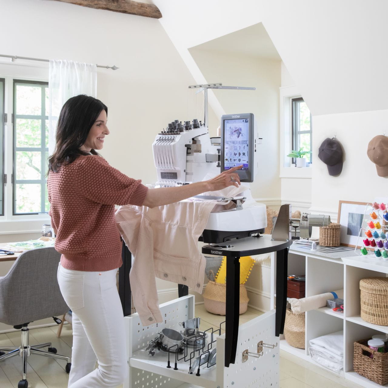 يسهّل الذراع الأسطواني تطريز العناصر مثل أكياس الحمل، والأكمام، وأرجل البناطيل، والقبعات. (يتطلب إطار قبعات إختياري وغيرها من الإطارات المتخصصة)