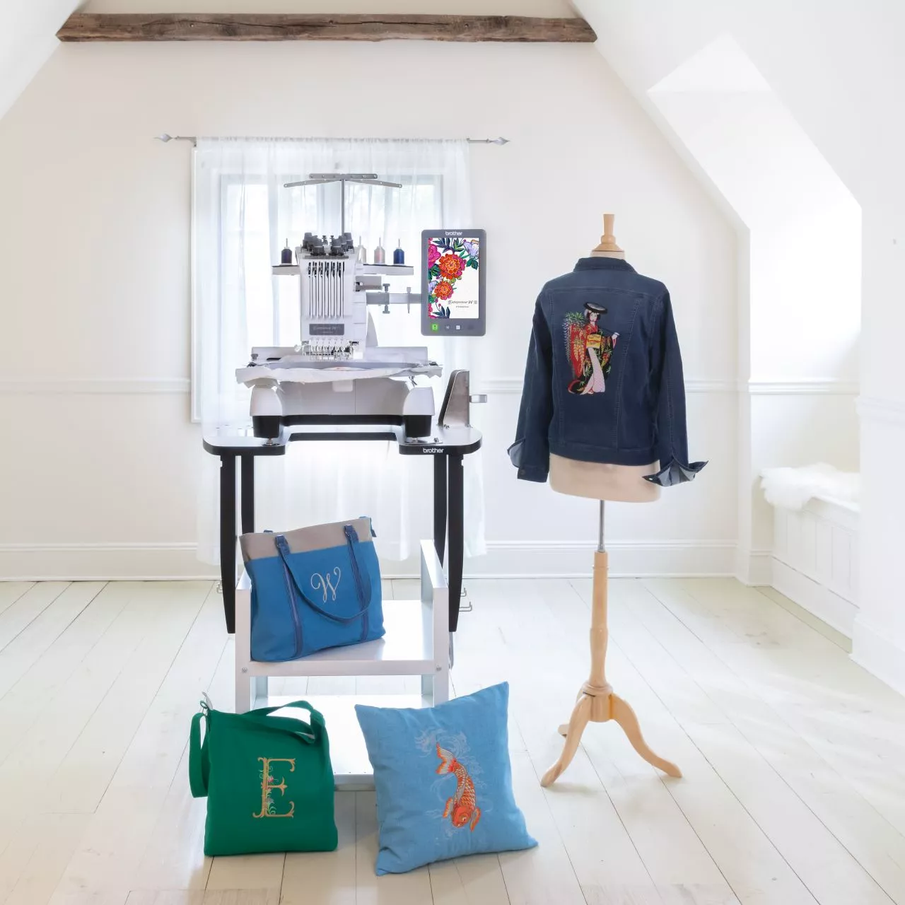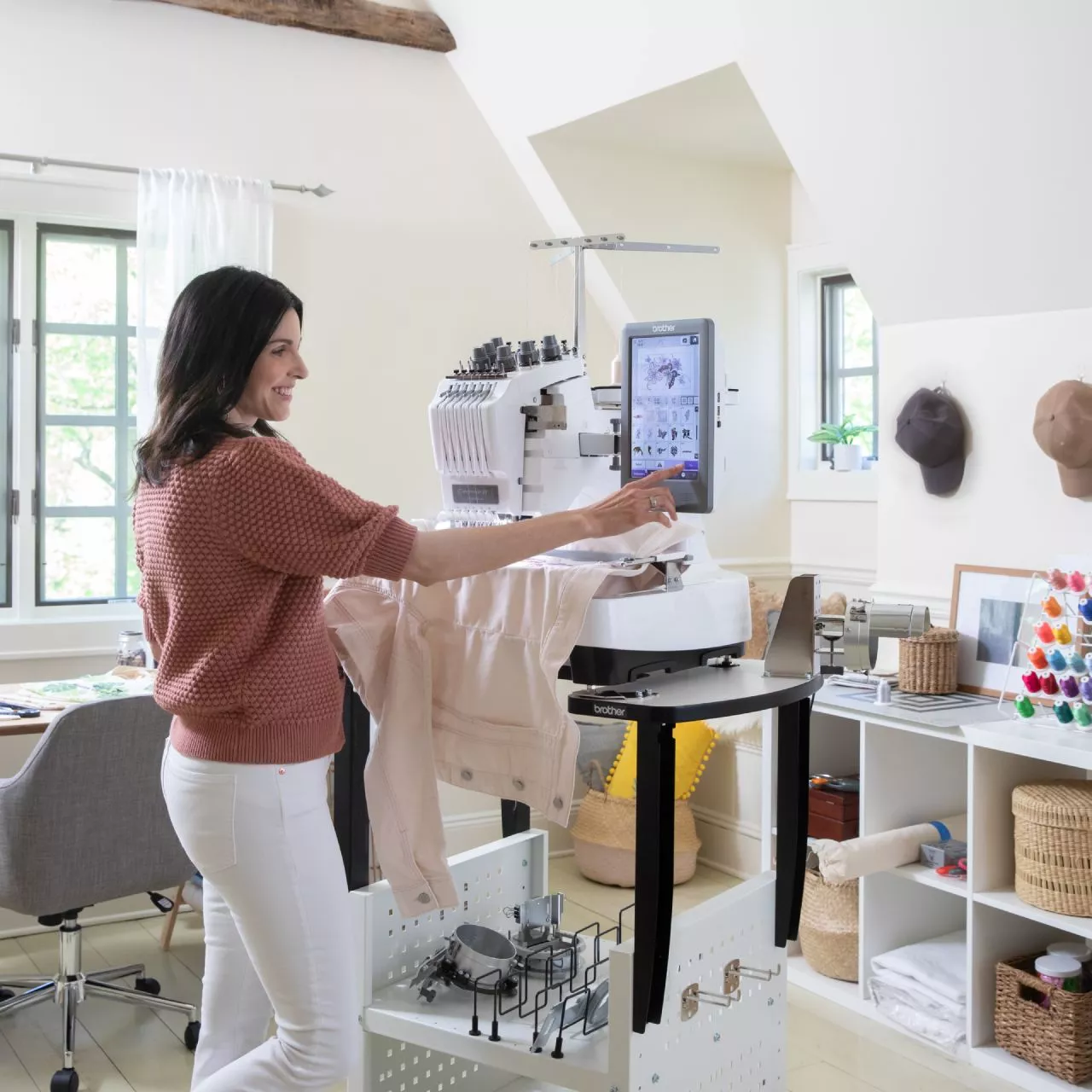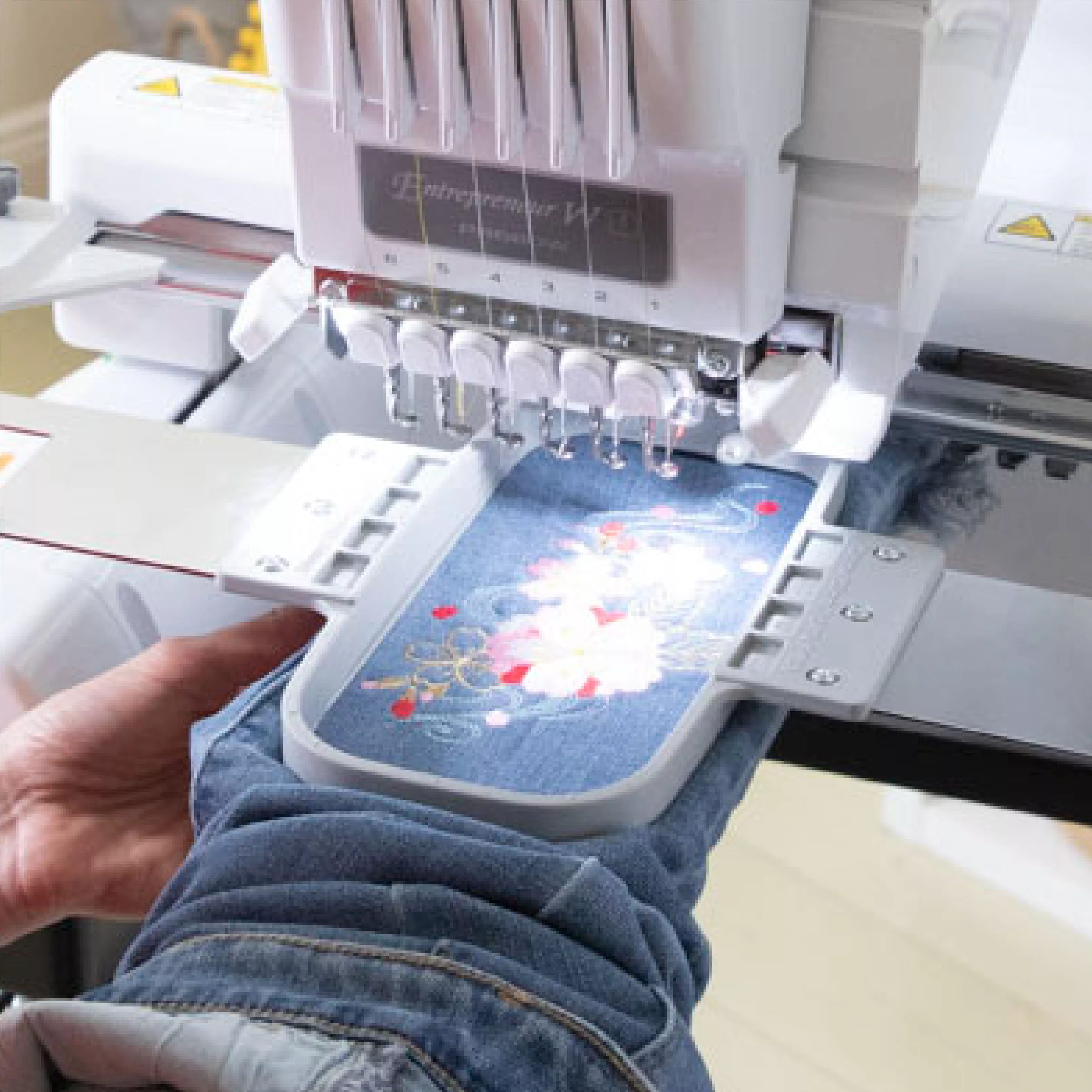 The tubular arm makes it easy to embroider items such as tote bags, sleeves, trouser legs, and caps. (Requires optional Cap Frame and other specialty Frames)